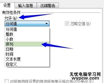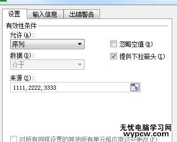下拉框篩選合用步驟2:在允許的位置選擇“序列“;在”來源“輸入需要制作的數據,如1111,2222,3333(這里需要注意的是數據之間的逗號為英文狀態下的逗號)