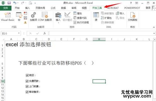 制作復選框步驟1:按鈕是在excel表中的“開發(fā)工具”選項卡里,默認安裝的EXCEL里,這個選項是沒有被選擇的,小編之前出過一篇“excel添加開發(fā)工具到工具欄”大家可以看一下,添加以下“開發(fā)工具”選項卡。