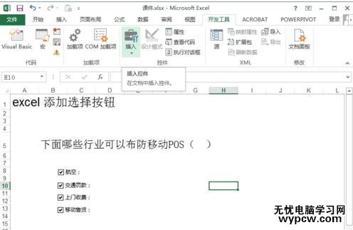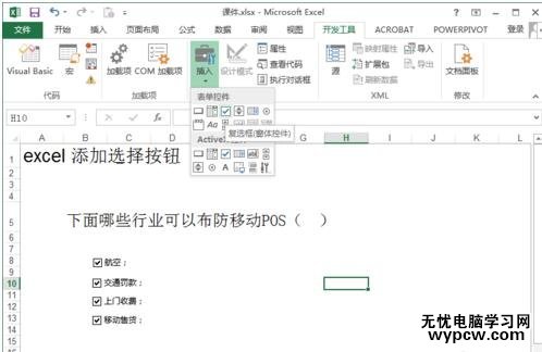 制作復選框步驟2:添加完“開發(fā)工具”選項卡后,找到里面的“插入”選項。這里就有要添加的選擇按鈕。