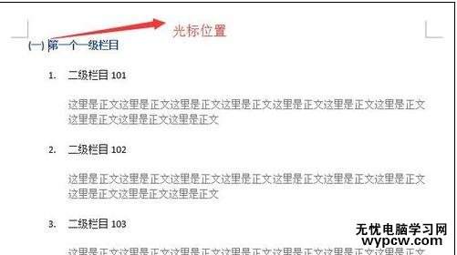 步驟二:如上圖,我寫(xiě)了3個(gè)一級(jí)欄目,并且分好了哪是標(biāo)題哪是正文。現(xiàn)在開(kāi)始制作word2013的目錄。首先要在當(dāng)前頁(yè)的前面加一個(gè)新的頁(yè)面,來(lái)放目錄。我們把光標(biāo)放在文字的最前面。