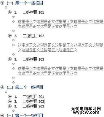 步驟六:在大綱視圖中,可以看到所有的欄目標(biāo)題和正文的前面,都出現(xiàn)了小圓圈。不用管它,我們先選中第一個(gè)標(biāo)題。