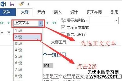 步驟九:然后點(diǎn)擊工具欄中的“正文文本”,在彈出的下拉列表中選擇“2級(jí)”。