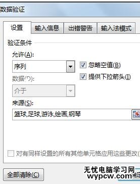 下拉菜單制作步驟3:驗證條件 允許 中選擇 序列