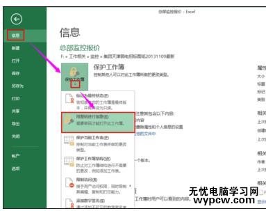 加密步驟2:在“信息”選項中,點擊“保護工作簿”的下拉菜單,選擇菜單中的“用密碼進行加密”