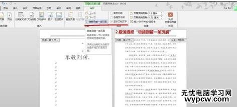 步驟三:雙擊第二頁頁面的底部,然后出現頁眉頁腳,注意到頁腳的右邊有“與上一節(jié)相同”字樣,說明第二節(jié)的頁腳和第一節(jié)的頁腳是連續(xù)的。選擇“頁眉和頁腳工具”,取消選擇“鏈接到前一條頁眉”