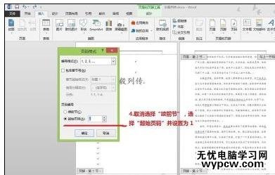 步驟六:在“頁碼格式”對話框中,取消選擇“續(xù)前節(jié)”,選擇“起始頁碼”并設置為 1