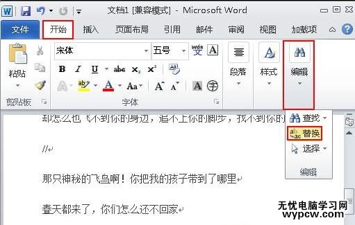 步驟一:用Word2010打開一篇文本文檔,在功能區(qū)選擇“開始”選項卡,然后再“編輯”區(qū)域點擊“查找”命令;