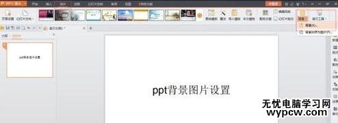 以上介紹的是如何插入圖片到PPT里,這里在為大家介紹把圖片設(shè)置為PPT背景。點擊插入旁邊的設(shè)計,可以看到右側(cè)有背景的選項。