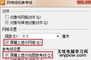 在網(wǎng)格線和參考線窗口里勾選屏幕里顯示網(wǎng)格,屏幕里顯示繪圖參考線,如下圖所示。