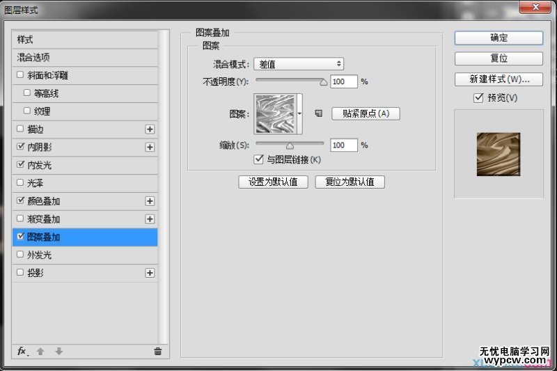 5-4、再來個圖案疊加(這里需要自定義一個圖案,先找一張綢緞圖片,褶皺多一點的,然后去色,尺寸調到128*128,再執行編輯》定義圖案即可),設置如下: