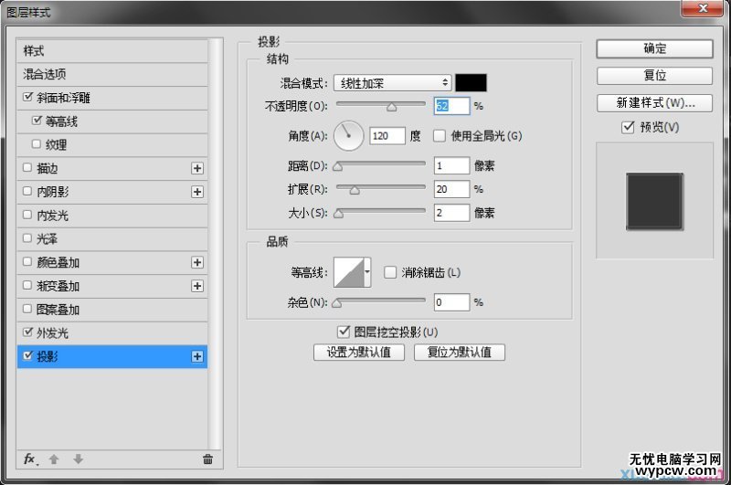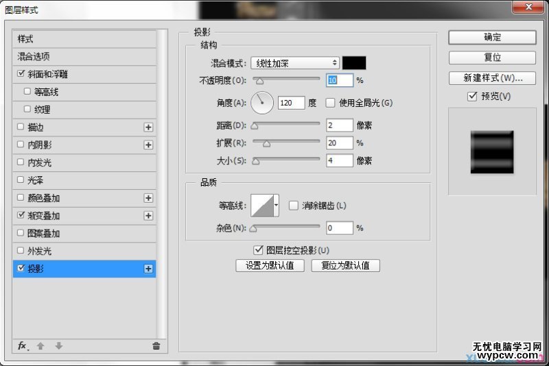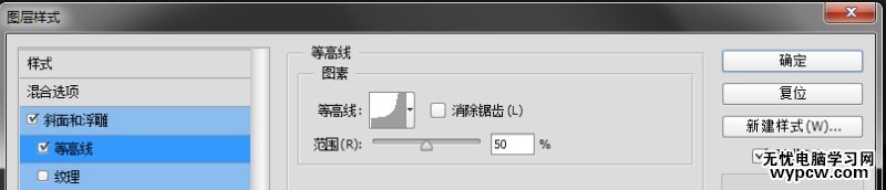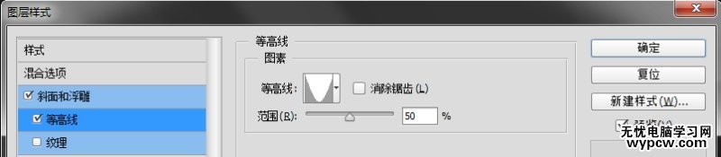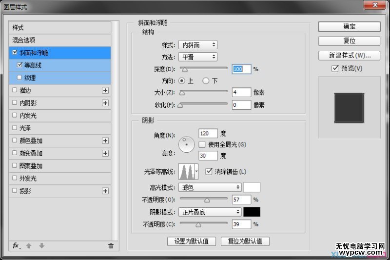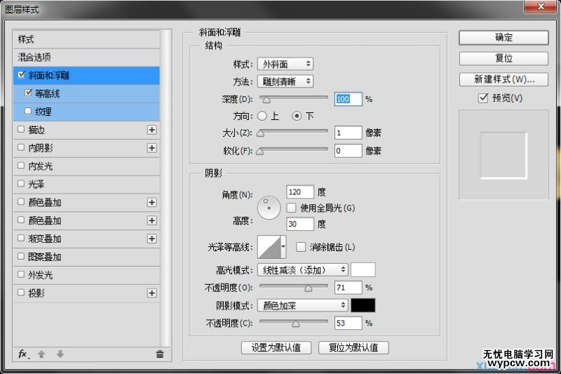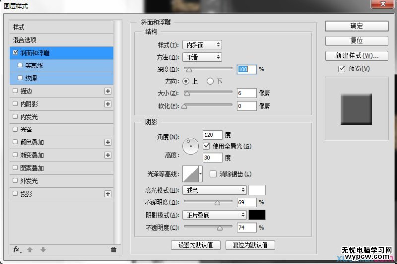 8-2、給石塊加一個斜面和浮雕效果,設置如下: