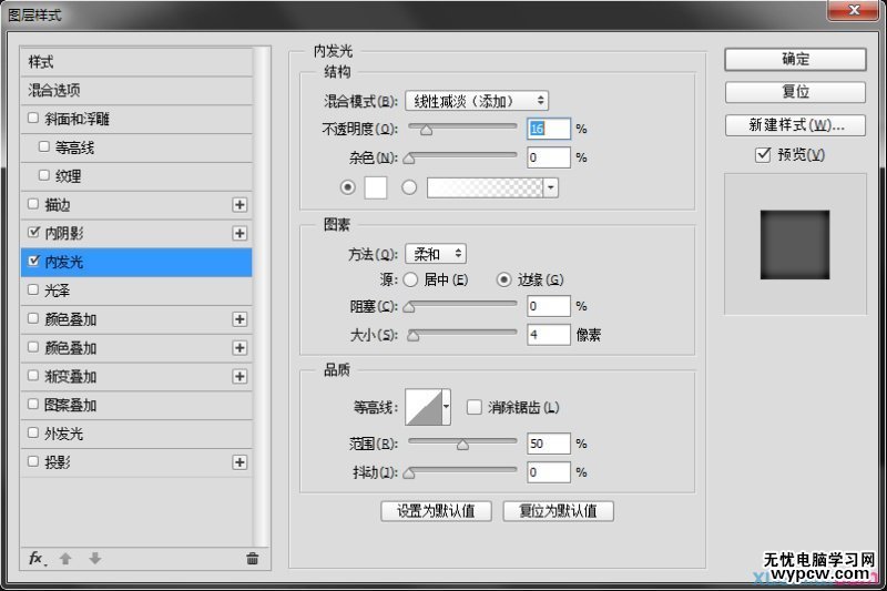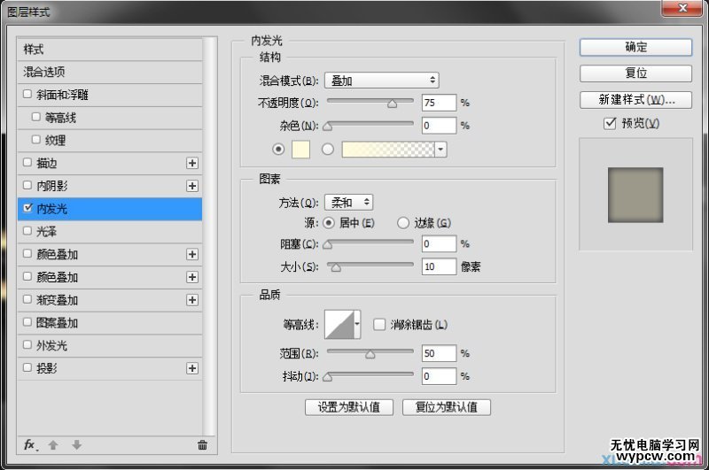 10-3、執行“濾鏡》模糊》高斯模糊”,只要0.2-0.4像素即可,然后給它添加一個內發光,設置如下: