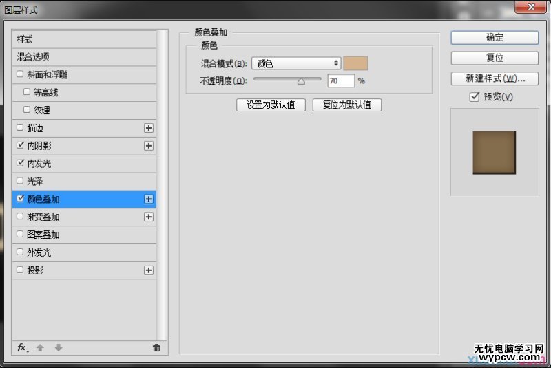 5-3、接著來個顏色疊加,顏色色值為#d4b38e,設置如下: