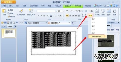 2點擊工具欄中的【行距】按鈕,選擇自己想要的行距或者點擊【其他行距】輸入自己想要的行距;