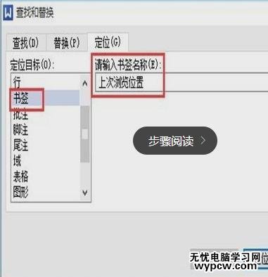 還可以通過ctrl+g查找和替換的快捷鍵把定位功能找到,然定位目標中找到”書簽“,然后在右側找到書簽下的書簽名,點擊定位
