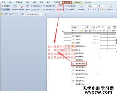 2.建立好表格后,如果要合并某些單元格,怎么辦呢?先選中需要合并的單元格,然后單擊鼠標右鍵,選擇合并單元格,或者在 表格工具頁面選擇合并單元格: