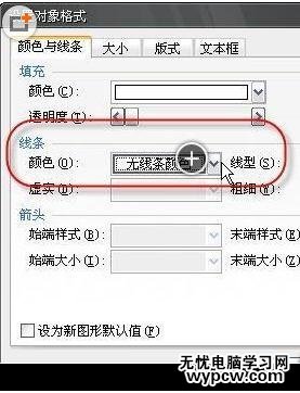 完成后,選中此矩形框,點擊右鍵,在彈出的菜單中點擊“設置對象格式”命令,打開“設置對象格式”對話框。點擊“顏色與線條”選項卡,在“線條”項目下“顏色”下拉列表中選擇“無線條顏色”項目,如圖所示。這樣我們做好的矩形框就看不到邊線了。