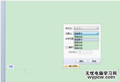 4、將鼠標滑動到下面,點擊一下 插入頁碼,然后選擇 底端居中,應用于整篇文章。如果是已有的文章要更改頁碼,也是一樣的方法。