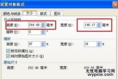 插入圖片后雙擊圖片,進入圖片設置屬性。選擇大小選項卡,選擇高度為244.49.寬度為146.17毫米。