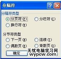 2、點擊分隔符之后,再分隔符窗口上面選擇分頁符,然后點擊確定,這樣就成功的插入頁面了