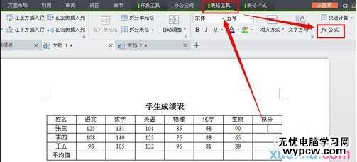 2/光標定位到計算的區域,然后在“表格工具”選擇卡,單擊“公式”。