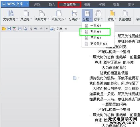 2、切換到“負面布局”點擊“分欄”選擇你想要的欄數,我這里選的是兩欄。