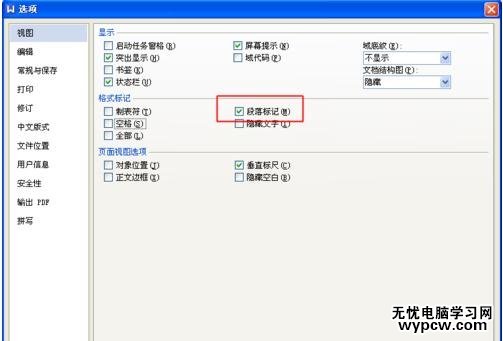 這時,我們依次點擊WPS 文字窗口左上角的“WPS 文字”--“選項”--“視圖”--勾選住“格式標記”下面的“段落標記”,其他格式標記不選即可。