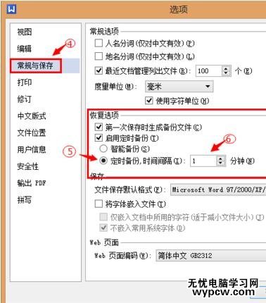 2、在選項的界面下,選擇常規與保存,然后設置定時保存時間就可以了。