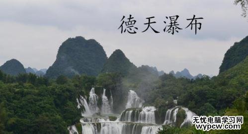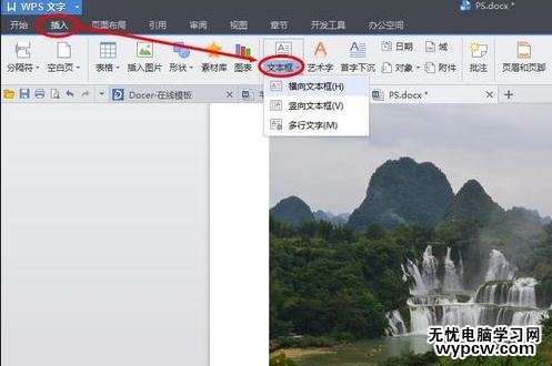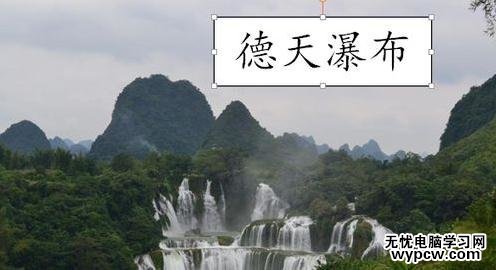 如圖所示,點擊插入>文本框>橫向。在文本框中輸入“德天瀑布”,選中這四個字,根據需要設置字體類型、大小和顏色。