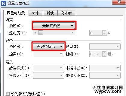 如圖所示,在設置對象格式對話框下的顏色與線條,選擇填充顏色:無填充顏色。線條顏色:無線條顏色。版式選擇浮于文字上方,單擊確定按鈕。
