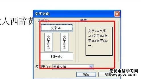 進入改變文字方向后,我們可以看到,我們可以看到文字方向分為四個樣式,選項我們喜歡的一款樣式比如從右向左讀的樣式選擇應用于整篇文檔。選擇完成后點擊確定。