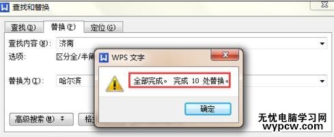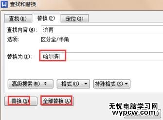 點(diǎn)擊【全部替換】按鈕,可以將該文章內(nèi)所有包含濟(jì)南兩字更改為哈爾濱,如下圖所示。