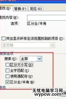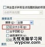 點擊之后我們可以看到有很多的選項,有區(qū)分大小寫、全字匹配、使用通配符、區(qū)分全/半角。我們勾選區(qū)分大小寫。然后搜索一下看看。