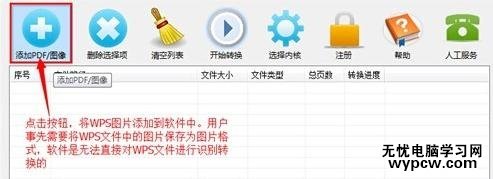 第一步:打開軟件,我們可以看到主界面上方有一排按鈕,我們點(diǎn)擊“添加PDF/圖像”按鈕,將WPS文件中保存的圖片添加到軟件中。