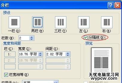 步驟六:如果想要在分欄的效果中加上“分隔線”,可以在“分欄”窗口中勾選“分隔線”確定即可。