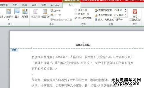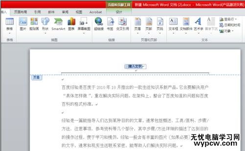 步驟二:在頁眉處出現了輸入文字的對話框,我們在“輸入文字”下方單擊輸入我們需要的頁眉文字。如下圖的“百度經驗百科”
