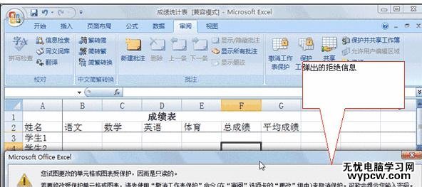 設置保護步驟3:在這些單元格里輸入數據,會得到圖18所示的拒絕對話框。這樣,我們就只能在沒有保護的單元格中輸入數據,這樣既不影響成績統計表的正常使用,又有效地保護了工作表不被誤操作破壞。