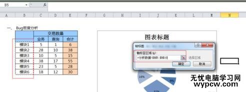 制作餅圖步驟5:在餅圖出來后,在excel上方找到數據選擇按鈕,點開后在彈出來的對話框中的圖表數據區域中,選擇需要顯示的數據區域即可。可以使用shift鍵選擇某一區域內的excel數據。