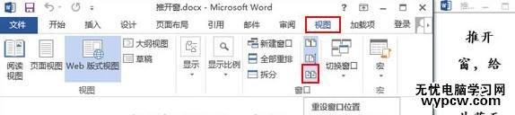 4、我們發現這兩個窗口并不是平分屏幕的,達不到最佳效果,那么,現在我們需要做的就是單擊“視圖”選項卡中的“重設窗口位置”按鈕。