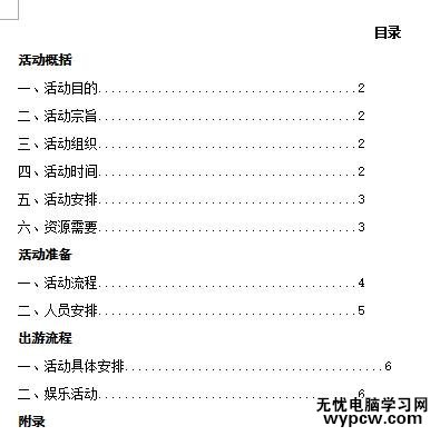 接下來插入目錄、具體內容包括(活動概括、活動準備、事件游程、附錄等等)詳情見下圖;