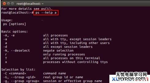 通過控制臺Terminal,執行ps的幫助命令“ps --help a”查看ps命令支持的參數列表。
