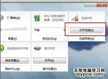 找到“windows移動中心”,鼠標點擊打開,若自己的無線網絡被關閉,則點擊“打開無線”按鈕,便成功啟用了無線網絡功能,您的無線網絡列表就可以顯示,如圖所示。