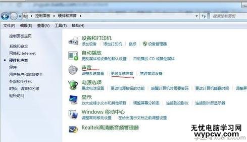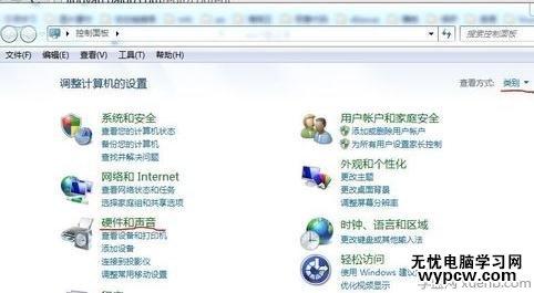 打開控制面板,選擇硬件和聲音