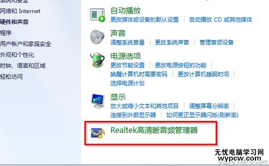2.在“硬件和聲音”界面中,選擇“Realtek高清晰音頻管理器”,如圖2所示