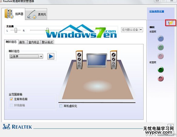 3.在“Realtek高清晰音頻管理器”界面中,點擊“黃色文件”的一個按鈕,如圖3所示