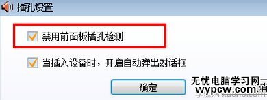 3、在出現(xiàn)的“插孔設(shè)置”對話框,將“禁用前面面板插孔”檢測的前面打上勾就可以解決了哦。