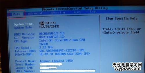 此時進入Bios的界面,如下圖所示,BIOS界面默認是在Main菜單下,作者用紅框框住的Main,在Main右邊還有“Advanced”、“Security”、“Boot”、“Exit”。