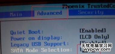 按向右的方向鍵“->”,此時會選中“Advanced”菜單。如下圖二。