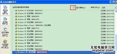 進入“添加或刪除程序”面板,在“顯示更新”前邊打“√”,在列表中找到“windows XP 安全更新(KB2839229)”,選擇刪除,如下圖: