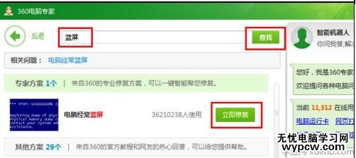 打開360電腦專家,輸入問題“藍屏”并點擊“搜索”按鈕,然后在搜索結果頁面中點擊“電腦經常藍屏 立即修復”按鈕。